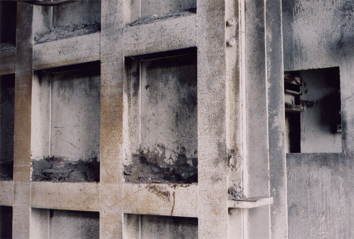 Über das steile Treppenhaus aus Gitterrosten kommt man auf einen Balkon, früher unterm Hallendach, jetzt nach dem Teilabriß im Freien. Von diesem Balkon aus verstreute ich Federn aus einem alten Kopfkissen. Sie rieselten wie Schneeflocken in die staubgrauen Abgründe der Schlucht zwischen Stahlpfeilern und stahlgestützten Mauern. Constri stellte sich in dieses "Schneetreiben" und ließ sich filmen und fotografieren. Die märchenhafte "Frau Holle"-Szene erzeugte eine ähnlich unwirkliche und melancholische Atmosphäre wie die Wiegenlieder an den Abbruchmauern.